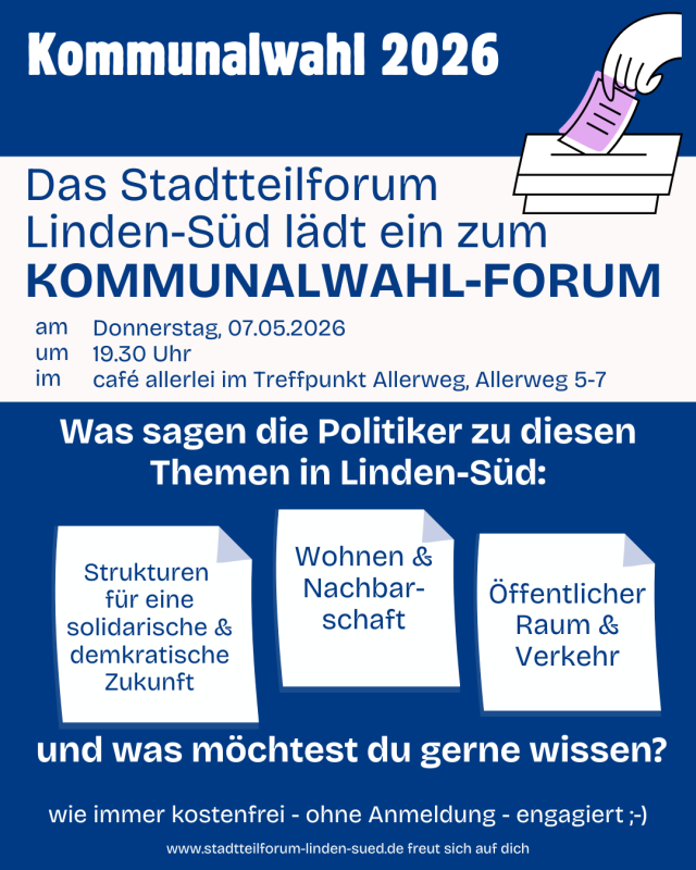 Es ist wieder soweit, wir starten die Planung für unser Stadtteilfest „Lust auf Linden-Süd“ am Samstag, 13.06.2026, von 14-22 Uhr. Ab sofort läuft die Anmeldung für alle, die mit einem Angebot, Stand auf der dann autofreien Deisterstraße dabei sein möchten.Bitte benutzt dazu das Online-Portal auf der Seite des Festes, wir haben die Inhalte aktualisiert: https://lust-auf-linden-sued.de/anmeldung-zu-lust-auf-linden-sued Bei Fragen