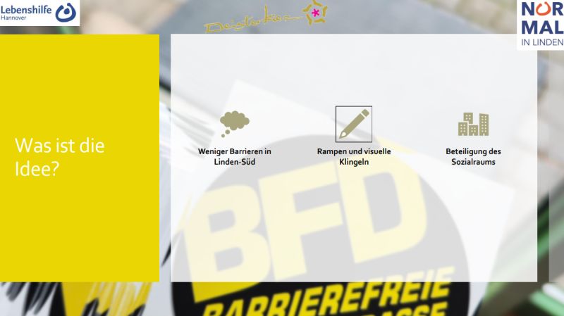Der Deisterkiez und das Normal in Linden (NiL) der Lebenshilfe Hannover haben gemeinsam neue mobile Rampen und visuelle Klingeln für Geschäfte und Institutionen in der Deisterstraße in Linden-Süd angeschafft. Das Projekt trägt den Namen #BFD21 – Barrierefreie Deisterstraße und wird durch Aktion Mensch gefördert. Ziel des Projekts ist es, Barrieren im Alltag abzubauen und die Zugänglichkeit von Läden, Einrichtungen und Treffpunkten im Stadtteil nachhaltig zu verbessern. Mobile Rampen erleichtern Menschen mit Mobilitätseinschränkungen den Zugang, visuelle Klingeln ermöglichen eine barriereärmere Kommunikation – insbesondere für gehörlose und schwerhörige Menschen.