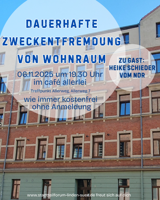 Wir laden ein zum Stadtteilforum Linden-Süd am Donnerstag, 06.11.25, um 19.30 Uhr im café allerlei, Treffpunkt Allerweg, Zugang über Allerweg 7. Thema: Dauerhafte Zweckentfremdung von Wohnraum Mit verschiedenen Gästen werden wir besprechen, wie sich die Situation in Linden-Süd darstellt und wie wir das Problem sichtbar machen können. Seit einiger Zeit ist Heike Schieder vom NDR … Weiterlesen …