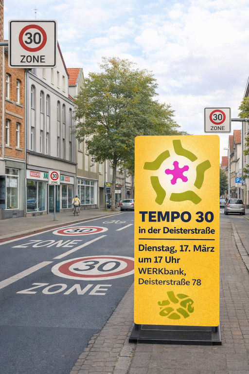 „Mit einem Aufruf zur Beteiligung an einer Arbeitsgruppe „Tempo 30 auf der Deisterstraße“ endete am 17. März 2026 ein Meeting in Linden-Süd. Dazu hatten Quartiersmanager Carsten Tech und Stefan Rose vom Deisterkiez e.V. in die Räumlichkeiten des neuen Projekts Werkbank in der ehemaligen Sparkasse eingeladen.“ Fortsetzung des Artikels s. https://punkt-linden.de/news/tempo-30-fuer-deister-und-wunstorfer-strasse/